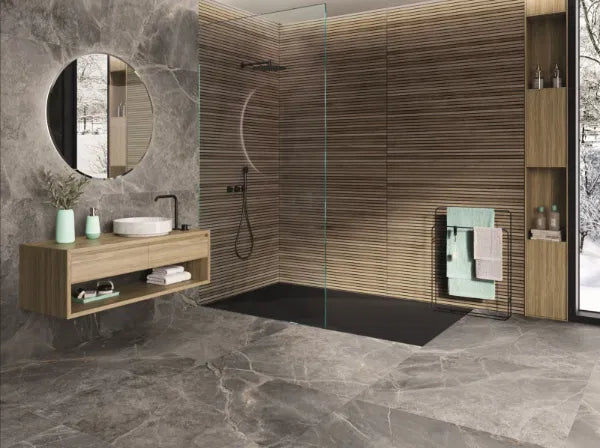 Large format rectified porcelain tiles designed to imitate wooden panelling. Suitable for use on both wall and floor.